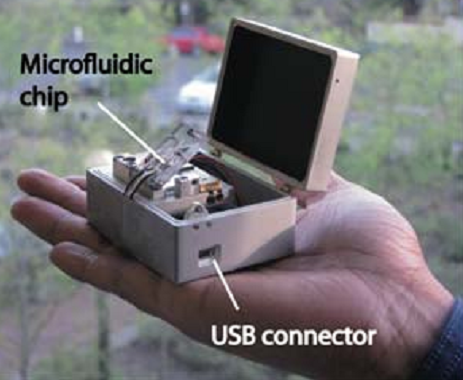 We have developed an inexpensive hand-held device (240 g) that implements microchip electrophoresis and isotachophoresis (ITP) with laser induced fluorescence (LIF) detection. This self-contained instrument, shown in Figure 1, integrates the functionality required for high voltage generation onto a microelectronic chip, includes LIF detection and is powered by a universal serial bus (USB) link connected to a laptop computer. We have shown that the device can provide quantitative analysis of fluorescent species, with a limit of detection of 100 pM. We have also integrated several ITP assays in the device for label-free detection of wide variety of chemicals, including chemical warfare agents, explosives and endocrine disruptors, with no sample processing.