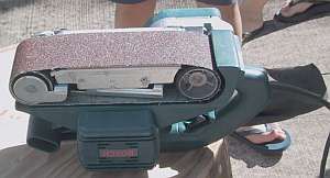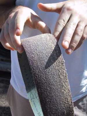 The first few stages of the sanding process are important to shape the barrel. Making it round, evening out unevenness, and removing surface blemishes are the goals at first. As you sand with the belt or orbital sanders, you will be able to feel the parts of the drum that are higher or lower, because the drum will seem to rise and fall as it rotates around. Don't try to push harder into the high spots to get rid of them, instead, try to hold the sander steady, letting the high spots push themselves harder into the sander as they rotate by.