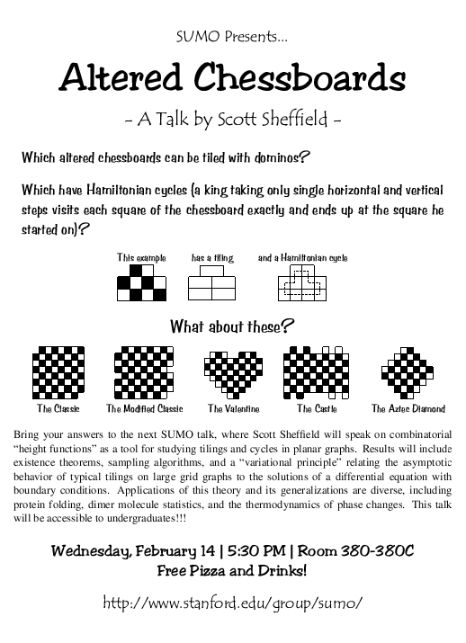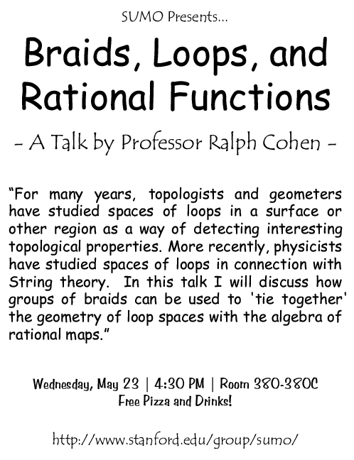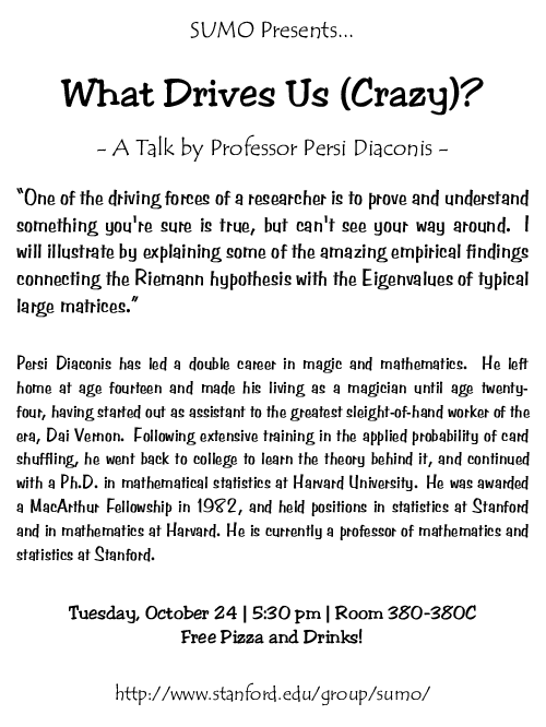 The Stanford University Mathematical Organization recently began a speaker series. The goal of the series is to let students listen to professors discuss their backgrounds and research, as well as to let students hear some interesting problems or ideas.