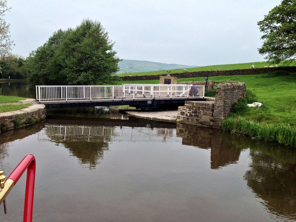 CanalBoatYorkshire2014 -- Swing bridge at Farnhill. Unlock via 'handcuff locks'.