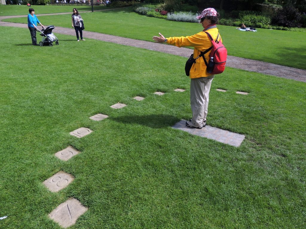 CanalBoatYorkshire2014 -- testing the sun dial in Yorkshire Museum gardens