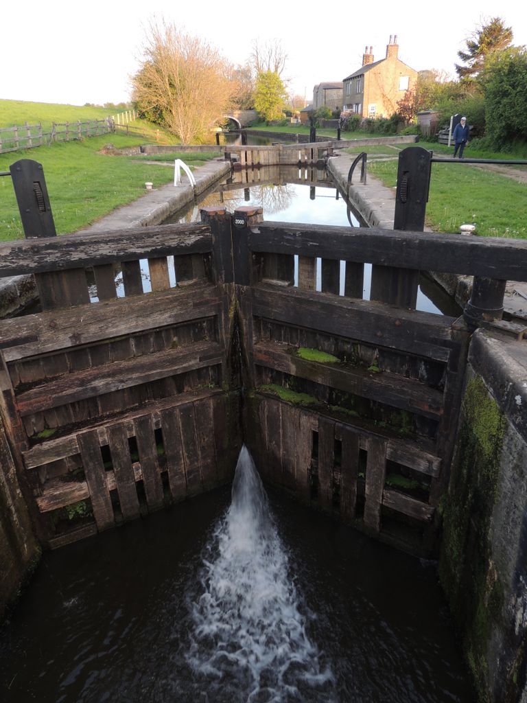 CanalBoatYorkshire2014 -- downstream end of Newton lock. Upper chamber is full. Water gushing is just leakage.