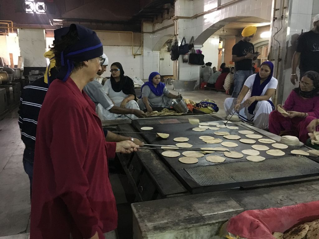 India2016 -- Deb flipping chapathis, Sikh temple kitchen, Gurudwara Bangla Sahib, New Delhi