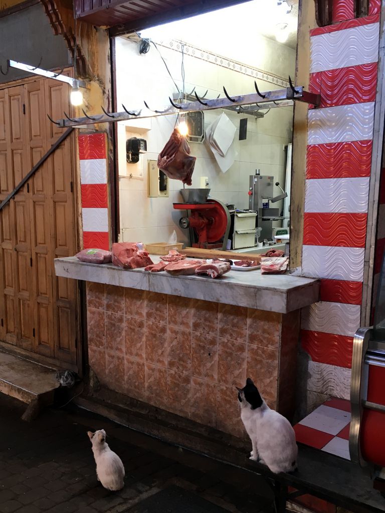 Morocco-2017 -- Fes: walking the Medina - butcher shop with ever hopeful cats