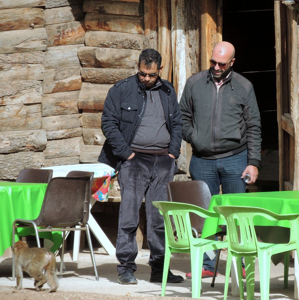 Morocco-2017 -- Parc Cedre Gouraud: guide Ali and driver Khalid regarding a macaque