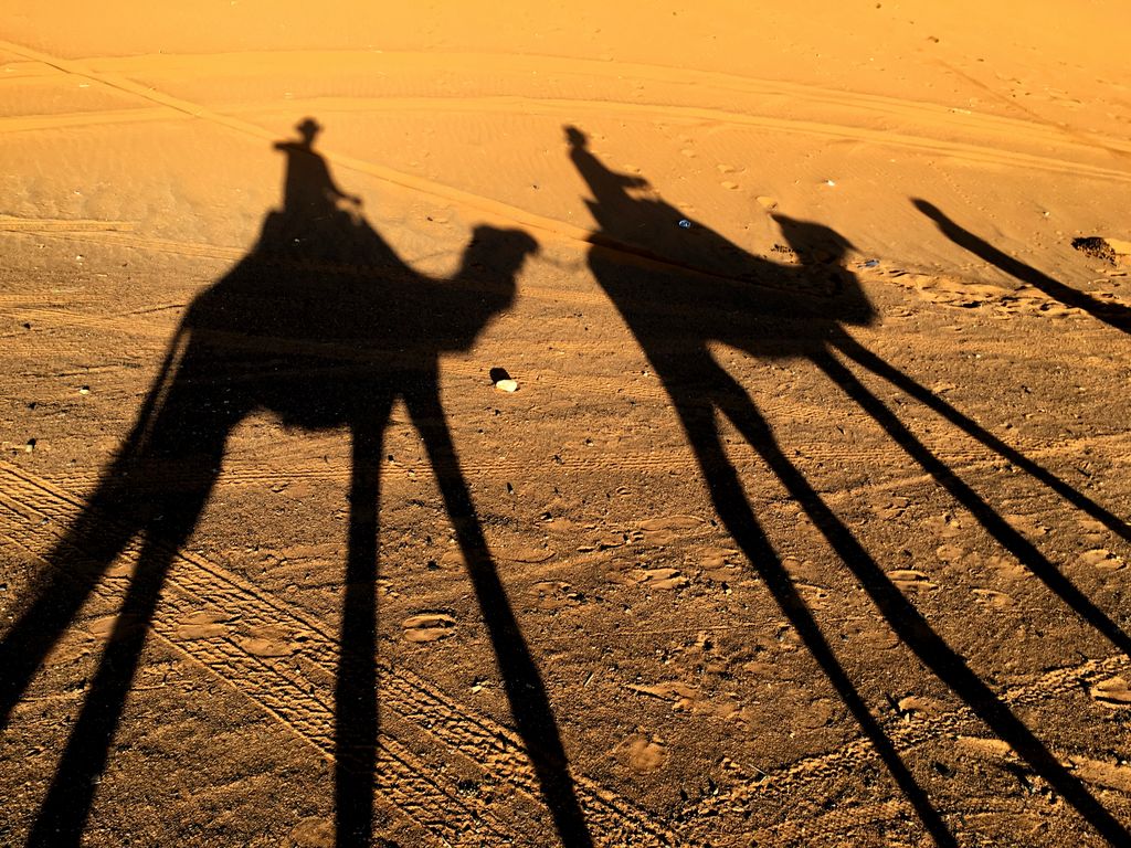 Morocco-2017 -- Merzouga: Golden Dunes - camel shadows