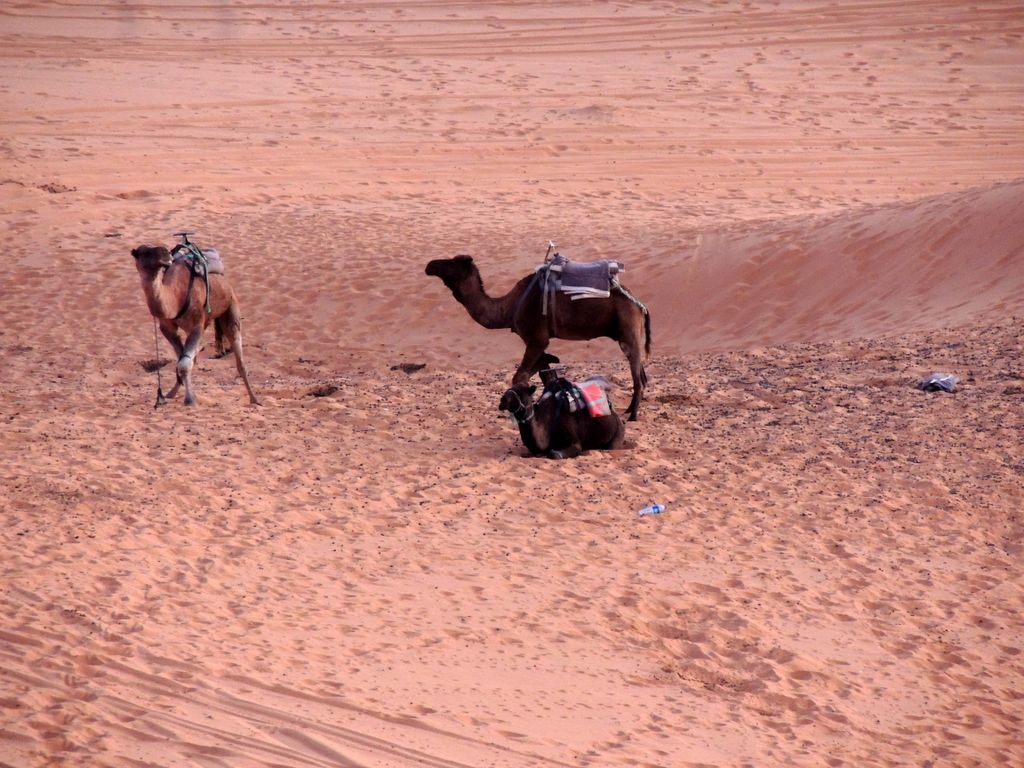 Morocco-2017 -- Merzouga: Golden Dunes - hobbled camels