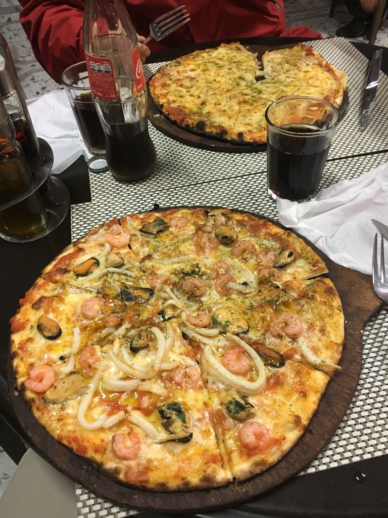 Morocco-2017 -- Marrakech - Ville Nouvelle - "best pizza in town" - Farouk's seafood pizza