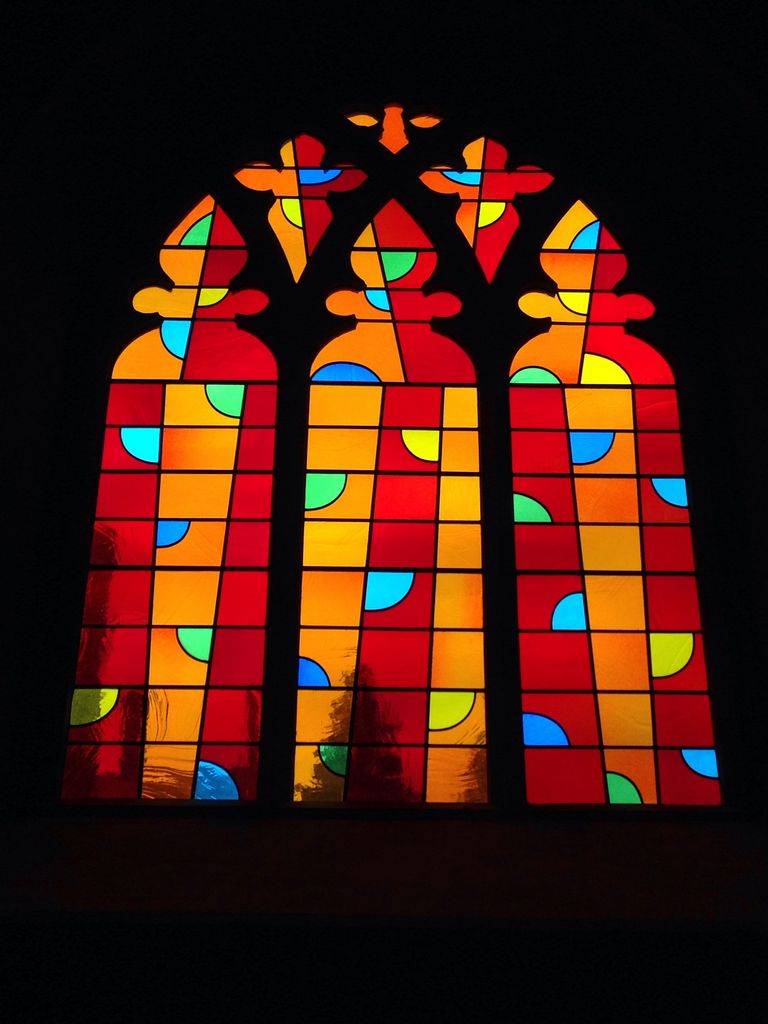 Norfolk2015 -- Stained glass in Norwich cathedrall casting orange light on the hallway