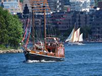 We hooked up with Oslo Kayaking to paddle along a good bit of Bygdoy island's shoreline (I had not realized at the time that had we paddled a bit further we would have got to the Fram museum). When we arrived, there was a surf-ski training session underway, with paddlers doing 500m sprints. We figured they were just killing time until cross country ski season The main waterfowl we encountered were eider ducks, famous for their down. We were also able to point out to our guide that Canada geese are different from barnacled geese, and that we were sorry they had to have Canada geese.