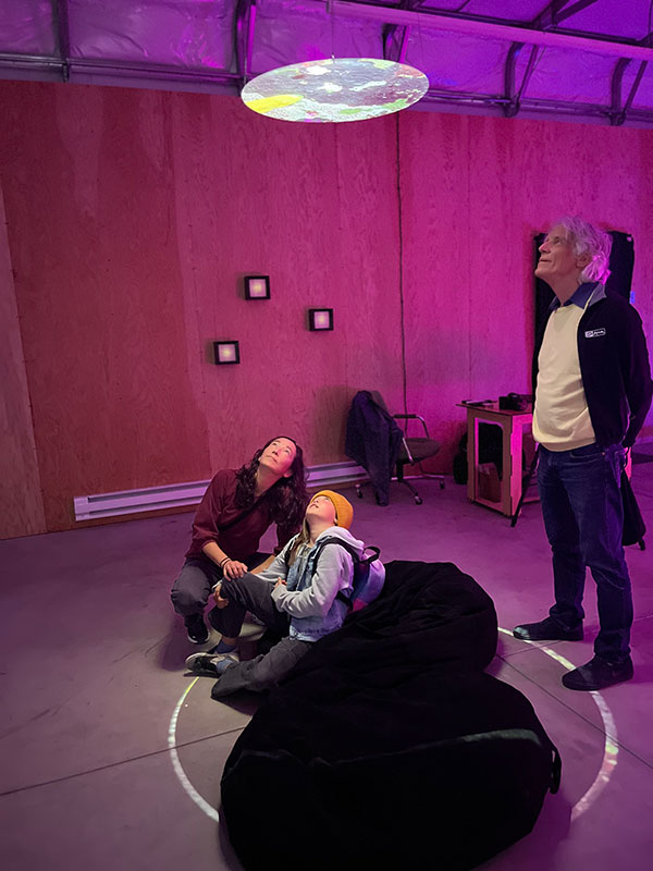Blue Lunar Eclipse is comprised of footage from tide pools superimposed on the dark side of the moon. Visitors lie on cushions and gaze up at the moon, which is alive with undersea exuberance.