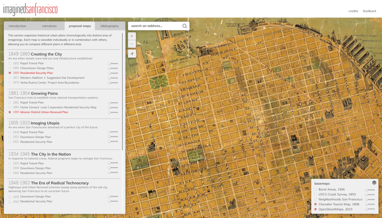 This project traces the history of urban planning in San Francisco, placing special emphasis on unrealized schemes to present the city as a sequence of material changes and a battleground for political power. Our team created an interactive site to house this project. We sought to make geospatial and historical analyses of San Francisco more accessible to the public.