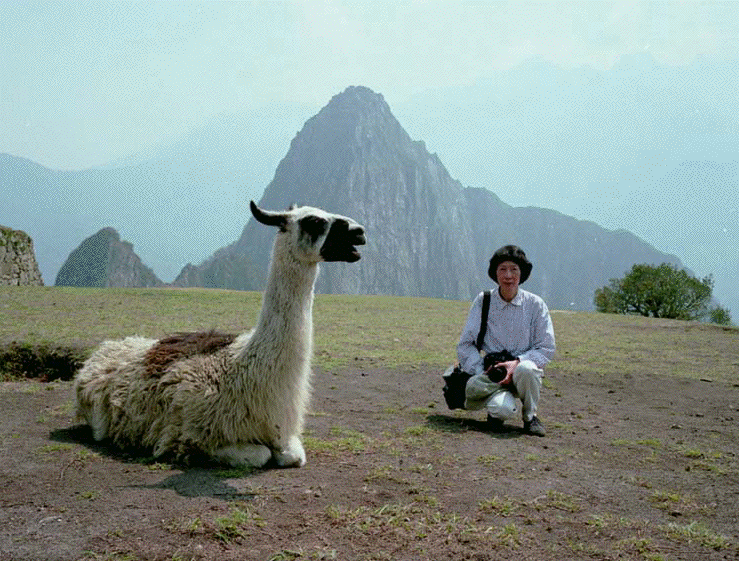 This picture was taken by the author's husband on a trip to Machu Picchu, Peru, in September, 1998. In the background isWayna Picchu (mountain) at the foot of which lie the famous ruins of the Incas (see Photo5 in the gallery). In the foreground is a llama indigenous to this region. The author tries to keep a safe distance from this seemingly friendly animal.