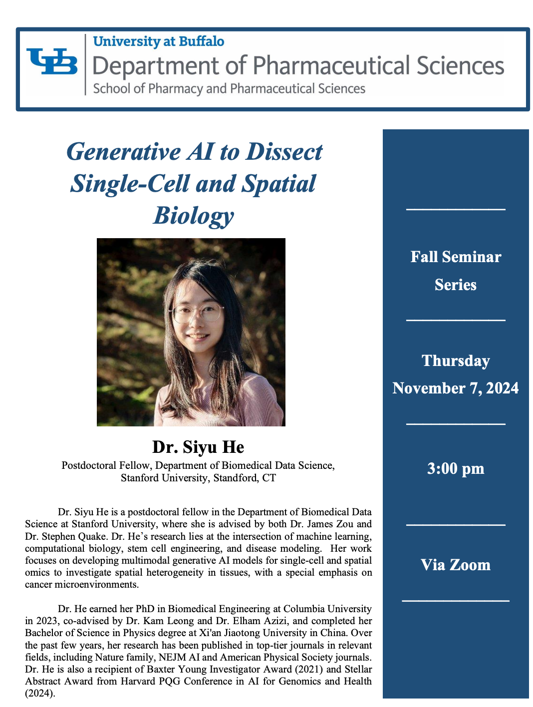 [2025-04] Invited talk at Department of Pharmaceutical Science at University at Buffalo, hosted by Prof. Sima Lao. Thanks for the invitation and I enjoyed the discussion a lot!