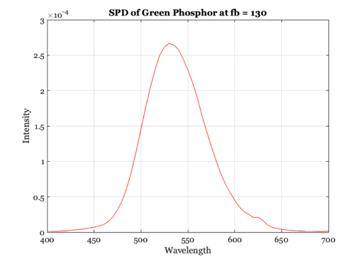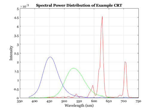 We must measure the main functions that define the color properties of any display: these are the phosphor spectral power distributions (SPDs). We measure these functions using a spectral radiometer, a device that measures the power per nanometer emitted by the display.