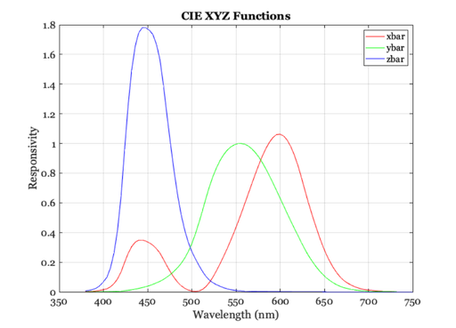 % Read in a display d = displayCreate('CRT-Dell'); phosphors = displayGet(d,'spd'); wavelength = displayGet(d,'wave'); % Plot the display phosphors ieNewGraphWin plot(wavelength,phosphors(:,1),'r-', ... wavelength,phosphors(:,2), 'g-',... wavelength,phosphors(:,3),'b-') xlabel('Wavelength (nm)'), ylabel('Intensity') title('Spectral Power Distribution of Example CRT'); set(gca,'xlim',[350 750]), grid on % To measure the XYZ values of these phosphors, we load in the xbar,ybar, % zbar functions defined by the CIE. These are also stored in the columns % of a matrix, called xyz. Because these functions are so widely used, % they are stored in the main toolbox area. ieNewGraphWin XYZ = ieReadSpectra('XYZ',wavelength); plot(wavelength, XYZ(:,1:3)); xlabel('Wavelength (nm)'), ylabel('Responsivity') legend('xbar','ybar','zbar'); title('CIE XYZ Functions'); set(gca,'xlim',[350 750]), grid on % To compute the (X,Y,Z) values of each of the phosphors by multiplying the % phosphor matrix times the xyz matrix. Notice that the phosphors are in % the columns of the matrix on the right, and the xbar,ybar,zbar functions % are in the rows of the matrix on the left. maxXYZ = XYZ'*phosphors % This calculation doesn't take into account the proper constants and % details of the formula. There is a routine that manages that for you. maxXYZ = ieXYZFromEnergy(phosphors',wavelength(:)); % The luminance of each phosphor is given by the Y values. The % maximum value is when the phosphors are set to maximum intensity. maxXYZ(2,:) % The total luminance the display can reach, with all three phosphors on, % is given by the sum of these three values, 100 cd/m^2 is a typical % luminance level for monitors. sum(maxXYZ(2,:))