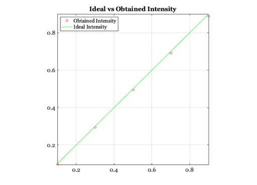 load cMatch/monitorGam ieNewGraphWin; plot(1:256,monitorGam(:,1)), grid on xlabel('Frame buffer'); ylabel('Emitted intensity of red phoshor'); title('Display "Gamma" function') % This is called the "gamma" function of the display. The reason for this % title is that the function is roughly a simple power function and the % exponent has historically been called "gamma." Here is a comparison of % the gamma function of the red phosphor and a power function with an % exponent of 2.2, the most common value. frameBuffer = 1:256; pred = ((frameBuffer)/256).^(2.2); plot(frameBuffer,pred,'k-',frameBuffer,monitorGam(:,1),'r-') xlim([0 256]); xlabel('Frame buffer'); ylabel('Intensity'); title('Comparison of Power function and red phosphor emission') legend('y = x^2^.^2', 'Red phosphor','Location', 'NorthWest'); grid on % For this display, you can see that the fit is much better using a larger % exponent, namely frameBuffer = 1:256; pred = ((frameBuffer)/256).^(2.7); plot(frameBuffer,pred,'k-',frameBuffer,monitorGam(:,1),'r-') xlim([0 256]); xlabel('Frame buffer'); ylabel('Intensity'); title('Comparison of Power function and red phosphor emission') legend('y = x^2^.^7', 'Red phosphor','Location', 'NorthWest'); grid on % Recall that we measured the emitted intensity using the maximum % framebuffer value. This corresponds to the column entries in phosphor, % and these are the signals emitted when the relative intensity is one. % To specify the intensity of the emitted light for any given frame-buffer % level, we can use the simple gamma function. For example, the spectral % power distribution of the light emitted by the green phosphor at a frame % buffer level of 130 is emitted = phosphors(:,2)*monitorGam(130,2); plot(wavelength,emitted), grid on xlabel('Wavelength') ylabel('Intensity') title('SPD of Green Phosphor at fb = 130'); % Frequently, we are interested in how to set the frame-buffer % level in order to obtain a given linear output intensity. To % determine this, we must calculate the inverse of the "gamma" % function. If we have fit a simple polynomial to the gamma % function, then we can calculate the frame-buffer setting by % inverting the function. So that given a linear intensity, l, % we can calculate the frame-buffer value as frame-buffer = % l^(1/gamma). ieNewGraphWin; intensity = 0:.001:1; predFB = intensity.^(1/2.7); plot(intensity,predFB) xlabel('Intensity') ylabel('Frame buffer level') title('Gamma Function Inverse'); grid on % Another way to perform this calculation is by creating a % look-up table that inverts the gamma function. You should take % a look at the code in the function "mkInvGammaTable" to see how % Xuemei Zhang and I create inverse gamma look-up table % functions. To see the code enter "type mkInvGammaTable" invGamTable = mkInvGammaTable(monitorGam,1000); plot((1:1000)/1000,invGamTable), grid on xlabel('Relative intensity') ylabel('Frame buffer level') title('Inverse Gamma Table Values'); % (We make invGamTables with more than 8 bits of resolution % because some of the frame buffers we have in the lab are 10 % bits.) % To look up the frame buffer value that will produce a % particular linear intensity, then, we round the intensity to 1 % part in a thousand (because there are a 1000 levels in the % inverse table) and then use that as an index. For example, to % calculate the frame buffer values that generate linear % intensities of [.1 .3 .5 .7 .9] we calculate as intensity = (.1:.2:.9); intensityX = round(intensity*1000) fb = round(invGamTable(intensityX,1)) % Now, let's see how well we did. Here are the intensities we % will obtain with these frame buffer values. obtainedIntensity = monitorGam(fb,1) % We can plot the obtained and desired intensities in a graph % We are close, but because of the quantization of the device we % do not obtain the exact linear intensities. plot(intensity, obtainedIntensity, 'o', intensity, intensity,'-'), grid on axis equal, axis square, axis tight set(gca,'xtick',(0:.2:1),'ytick',(0:.2:1)) %identityLine = line([0 1],[0 1]); legend('Obtained Intensity', 'Ideal Intensity', 'Location', 'NorthWest'); title('Ideal vs Obtained Intensity');
