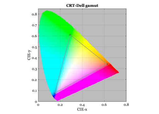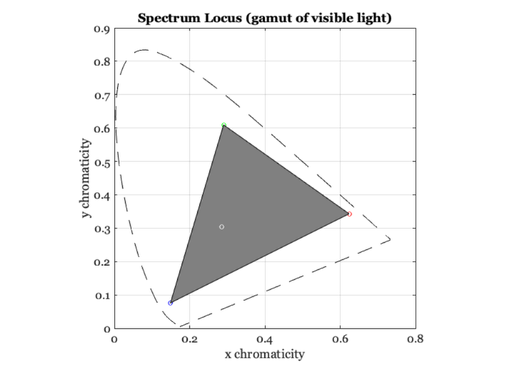Suppose you are an LCD manufacturer, and you know that if you had an ideal LCD, each of the R,G,B color channels would emit light according to the SPD given in monitors.mat. We have already plotted the color gamut of such a monitor.